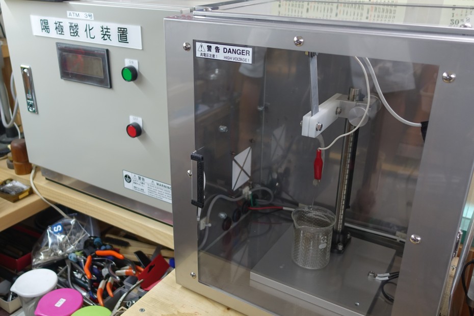 タンタルの指輪に関する苦労はさらに続く。タンタルは黒い素材のため女性は好まないが、着色すると金属アレルギーの原因となってしまうため製品化が難しい。そこで知人に群馬大学の先生を紹介いただき、陽極酸化技術を共同開発。電解液に指輪を入れて電流を流すことで、表面に酸化被膜を形成。電解液の種類や濃度・温度などの電解条件を組み合わせることで、金色・青色・緑色・赤色などの色を出すことに成功した。研究開発費用は梅澤指導員の支援を受けながら群馬県の補助金を申請・活用したという。