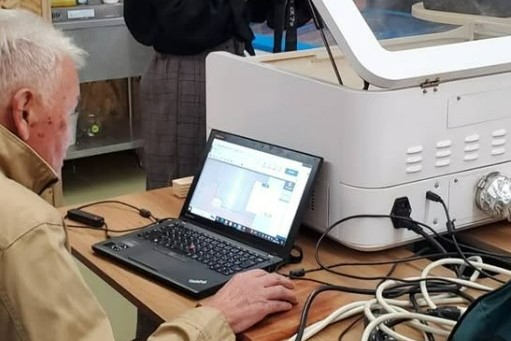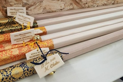 2024(令和6)年11月に開催された農林水産省主催大紀町モニターツアー「伊勢と熊野をつなぐ町・熊野古道伊勢路の旅」は、インバウンドの旅行商品を扱うエージェントや台湾のYouTuberを招待したイベント。きのわ木工堂による古道杖の杖飾り用「木札づくり」が行われ、この新しいレーザー加工機が大活躍した。三浦指導員も支援する中、モニターツアー中のお客さまが名前、ロゴ、イラストなどを自分でデザインしてもらって、データに取り込み、レーザーで木札に焼き付けるもの。杖のアクセサリーとして記念に持ち帰っていただいた。