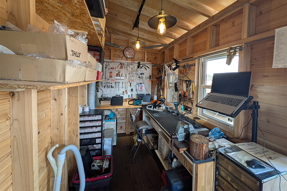 2024(令和6)年1月、「ライフボックス・ムラタ」の店舗軒下に「メンテナンス工房」が完了した。木材を使用したウッドデッキ付き、約2坪の小さな工房ながら、設置後の反響は非常に大きく、期待を上回る効果をもたらしている。まず、工房が秘密基地の趣を持つことで、幅広い年代層の男性客の注目を惹きつける要因となった。中には1時間も店舗内で商品を眺めているお客様や、北九州市や広島県から毎週のように来店してくれる熱心なお客様も現れている。また、工房を何度も見学しチェーンソーの使い方を村田社長からしっかり学んでから、購入するお客様もいるとのこと。