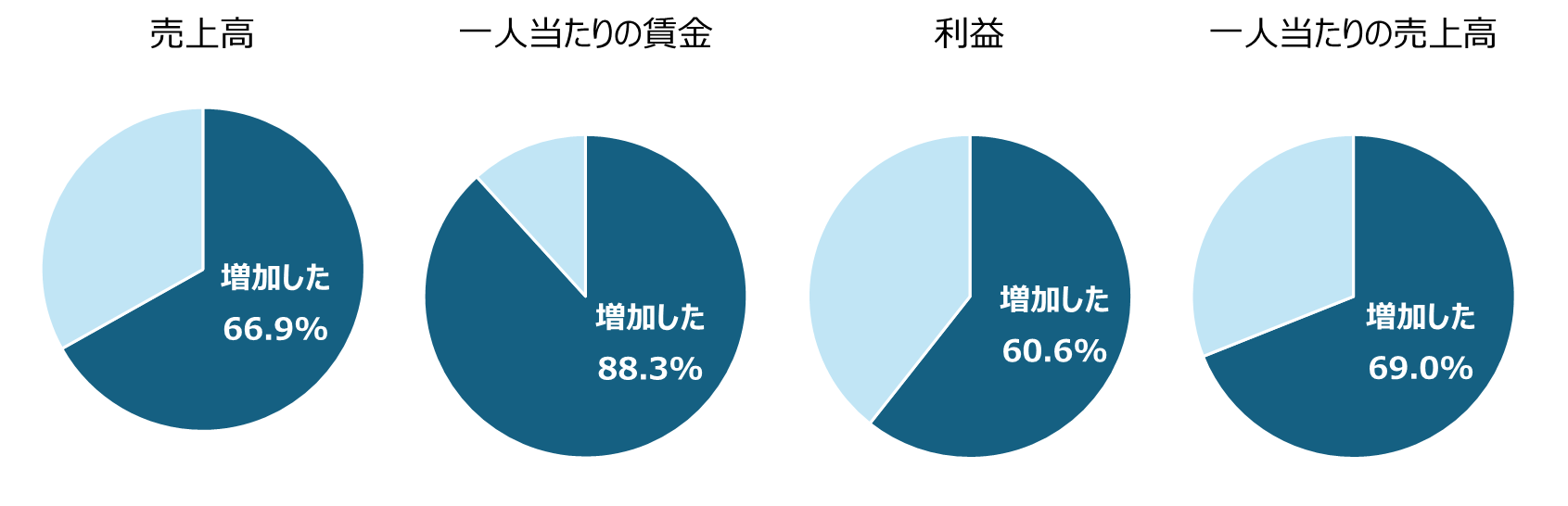これらの結果は、ものづくり補助金を活用した設備投資により、賃金の増加を上回るペースで売上高が増加したことが要因と考えられます。実際、アンケートでは、一人あたり売上高が「増加した」と回答した事業者が69.0%に達しており、ものづくり補助金が、その事業目的である「生産性向上の促進」に寄与したことが伺えます。